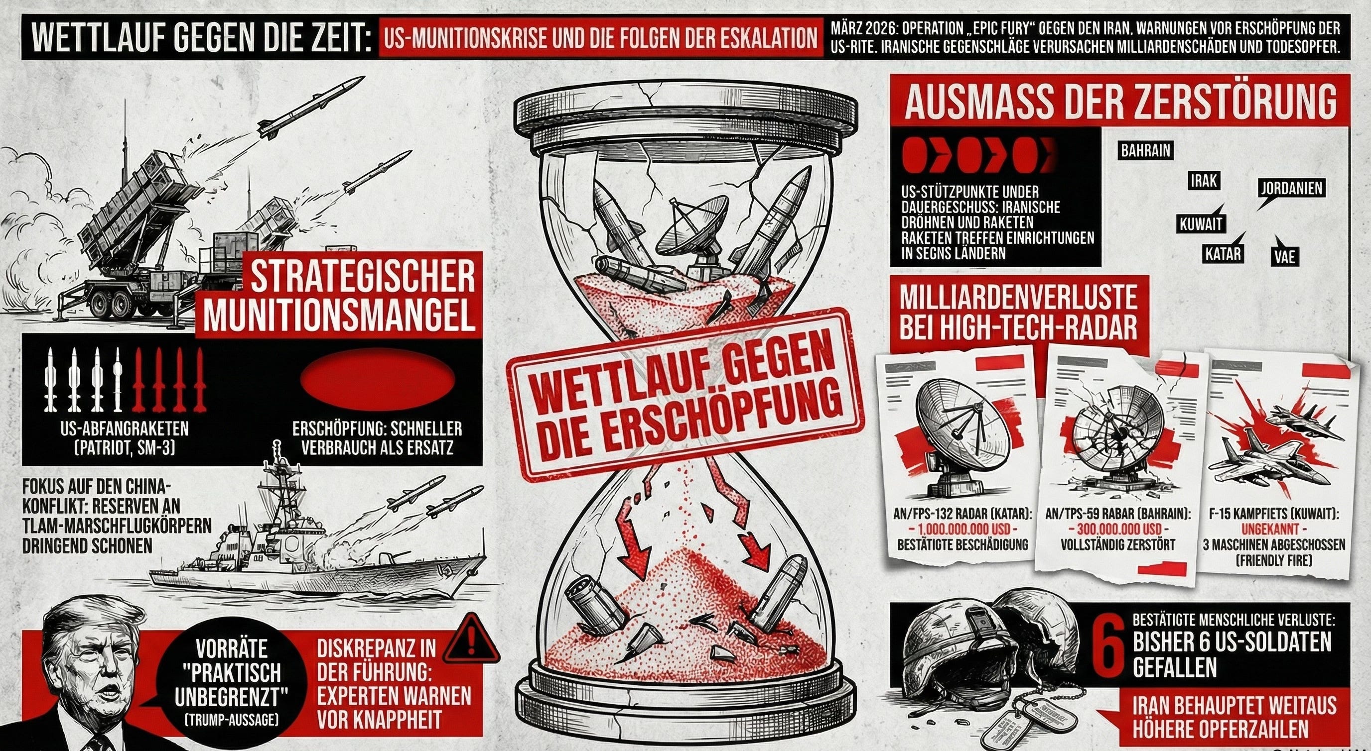 Die Bilanz ist eindeutig: immense materielle Verluste an US-Infrastruktur, Radarsysteme im Wert von über einer Milliarde Dollar vernichtet, steigende zivile und militärische Opferzahlen, eine diplomatische Schockwelle bis nach Europa — und im Hintergrund eine tickende Uhr der Rüstungsindustrie, die den USA im Indopazifik zunehmend die strategische Handlungsfähigkeit entzieht.